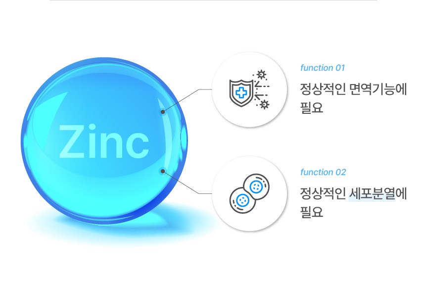 아연은 생체 내 효소의 구성요소로 핵산과 아미노산 대사에 관여하며 정상적인 세포분열에 필수적인 요소입니다.