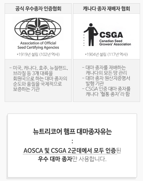뉴트리코어 대마종자유 AOSCA & CSGA 인증(우수 대마 종자)