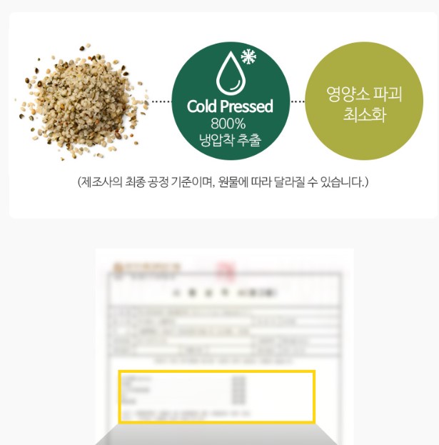 뉴트리코어 대마종자유 NCS 냉압착(Cold Pressed) 추출공법 : 잔류용매 5종 불검출