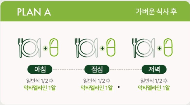 - 아침 일반식 1/2 후 악타멜라인 1알