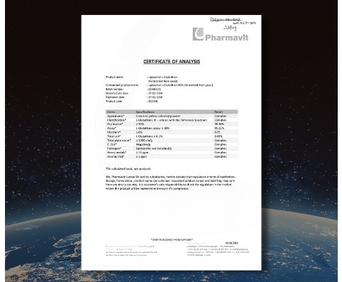 25년 전통의 전물기업 네덜란드 Pharmavit사의 글루타치온 순도 90% 리포좀 제형공법 적용 원료