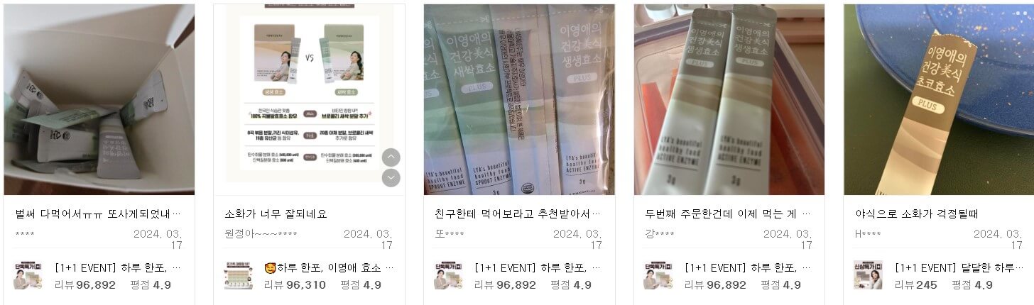 건강기능식품을 고를 때 가장 많이 보는 부분이 이 제품이 진짜 효과가 있을까 하는 부분이라 이영애 효소도 제일 먼저 후기 먼저 찾아봤어요. 정말 많은 사람들이 이영애 효소를 만족하고 있고 재구매도 많이 하고 있더라고요.