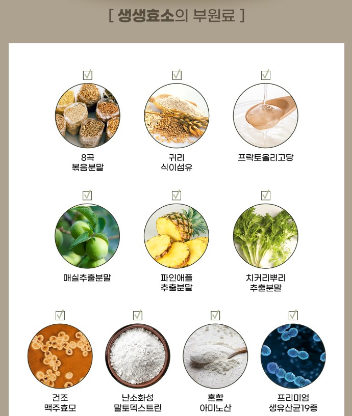 생생효소의 부원료는 매실추출분말과, 파인애플 추출분말, 치커리뿌리 추출분말, 건조 맥주효모, 난소화성 말토덱스트린, 혼합 아미노산, 프리미엄 생윤산균 19종이 함유되어 있습니다.