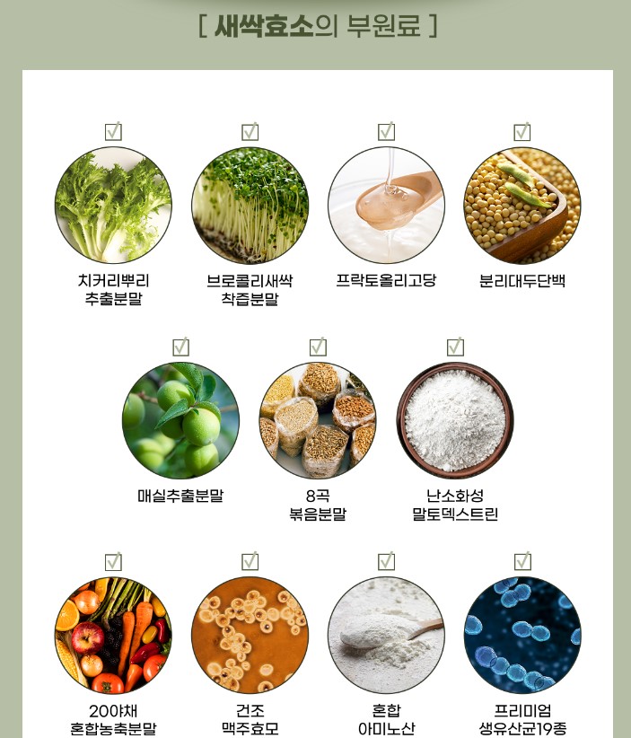 새싹효소의 부원료는 매실추출분말과, 8곡볶음분말, 20 야채혼합농축분말, 건조 맥주효모, 난소화성 말토덱스트린, 혼합 아미노산, 프리미엄 생윤산균 19종이 함유되어 있습니다.