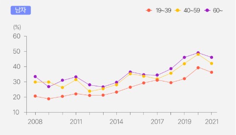 특히 남자는 모든 연령에서, 여자는 60대 이상에서 증가하는 추이를 보이고 있습니다.