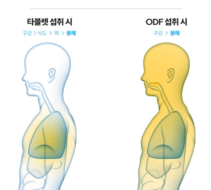 구강용해필름은 영양소와 성분을 효과적으로 빠르게 흡수하기 위해 개발된 필름 제형입니다. 물 없이 간편하게 입안에서 녹여 섭취하는 제품으로 타정대비 약 2배 빠른 흡수율을 자랑합니다.