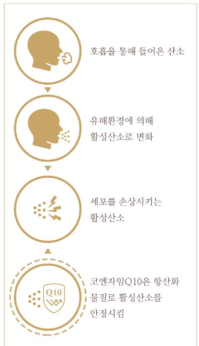 코엔자임 Q10은 호흡 및 에너지 대사과정에서 생성되는 유해산소를 안정시켜 유해산소가 몸속 세포 및 기관을 공격하는 것을 막아줍니다.