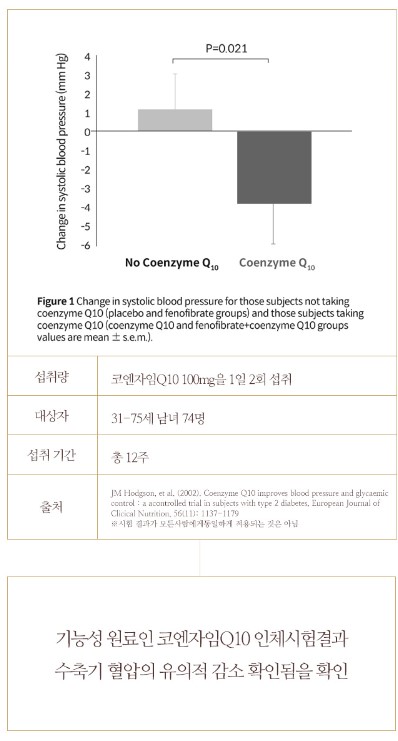 코엔자임 Q10은 식약처로부터 항산화와 높은 혈압감소에 도움을 줄 수 있음으로 기능성을 인정받은 원료입니다.